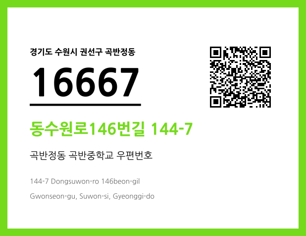 📮 우편번호16667|경기도 수원시 권선구 동수원로146번길 144-7 (곡반정동, 곡반중학교)지도위치